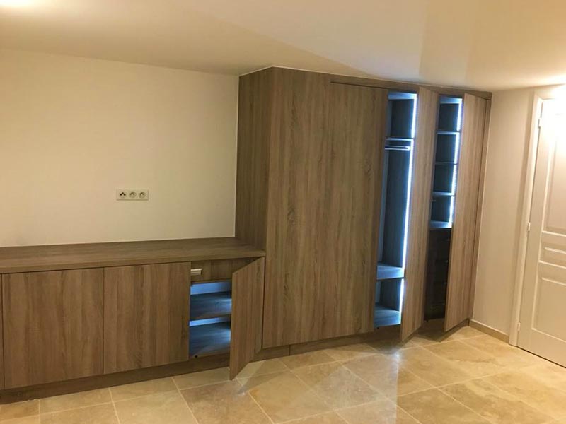 Nos menuisiers effectuent tous vos travaux d’aménagement et de pose de placards, tout en respectant votre demande et le délai convenu.